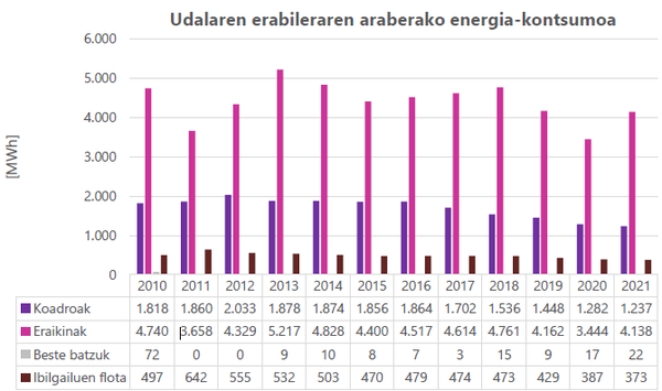 - 2021ean, Udalaren energia-kontsumoa 5.768 MWh-koa izan zen (0,38 MWh/bizt.); % 24,4 txikitu zen 2013tik* (7.635 MWh; 0,53 Mwh/bizt.).