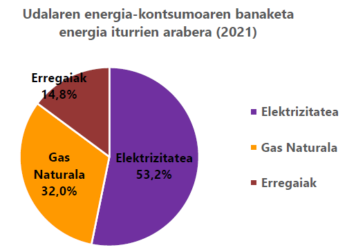 - Argindarra da (% 58) Udalaren energia-iturri nagusia, 2.647 MWh-rekin 2021ean; bigarren iturria, berriz, gas naturala da (%36), eraikinetan pisu handia duena.