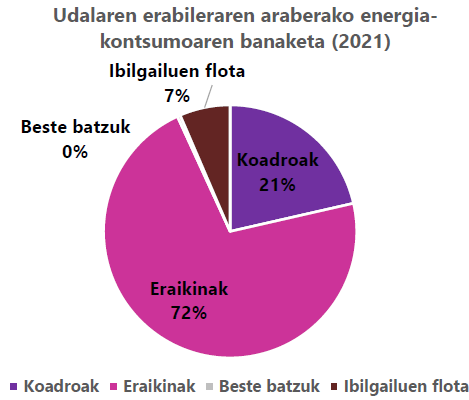 - Eraikinena da Udalaren energia-kontsumo handieneko erabilera (% 72); ondoren daude argiteria-panelak (% 22) eta ibilgailu-flota (% 6).